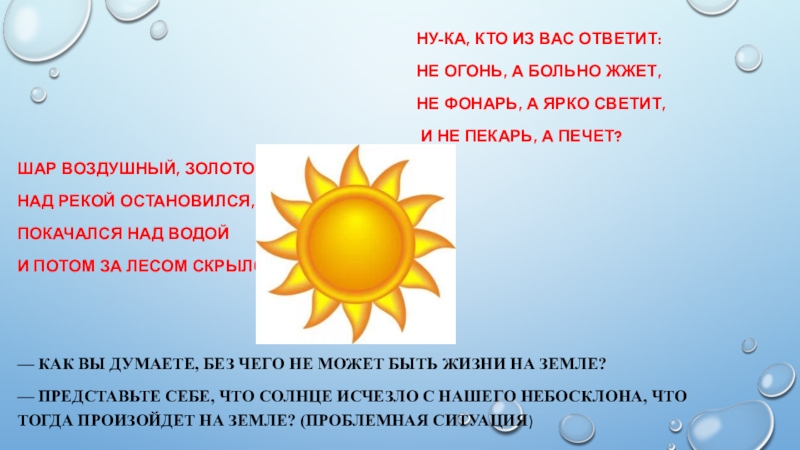 — Представьте себе, что Солнце исчезло с нашего небосклона, что тогда произойдет на Земле? (Проблемная ситуация)