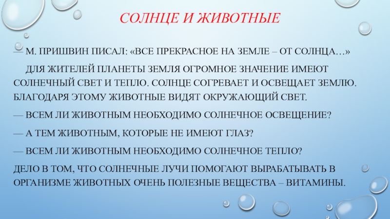Для жителей планеты Земля огромное значение имеют солнечный свет и тепло. Солнце согревает и освещает Землю. Благодаря этому животные видят окружающий свет.