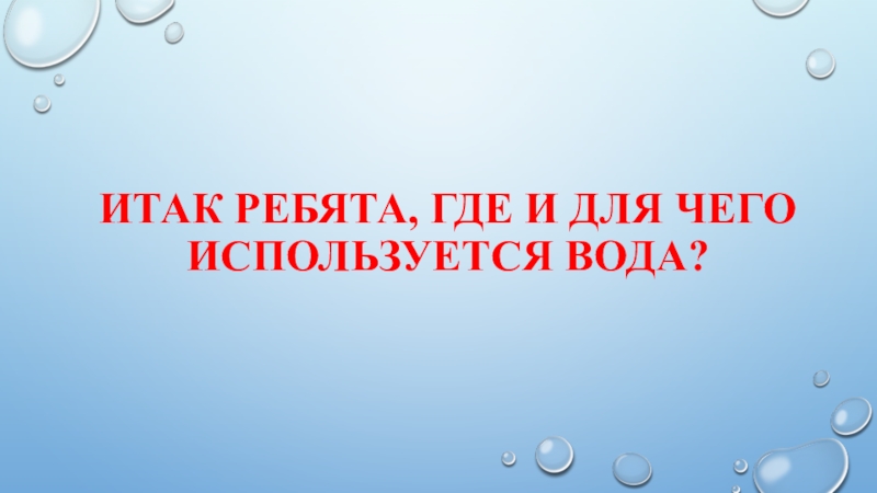 3. средство гигиены (Вода моет всех людей, животных, города, машины, дороги). Одним словом вода необходима для поддержания чистоты.