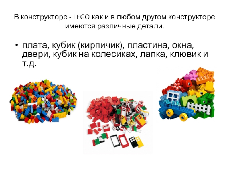 плата, кубик (кирпичик), пластина, окна, двери, кубик на колесиках, лапка, клювик и т.д.