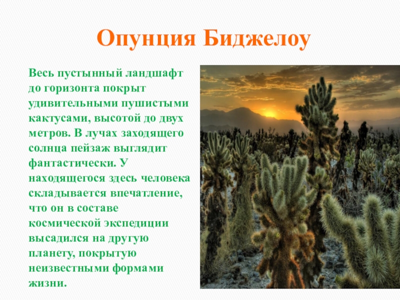 Весь пустынный ландшафт до горизонта покрыт удивительными пушистыми кактусами, высотой