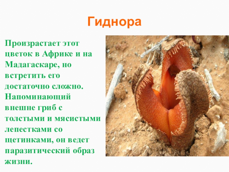достаточно сложно. Напоминающий внешне гриб с толстыми и мясистыми лепестками со щетинками, он ведет паразитический образ жизни.