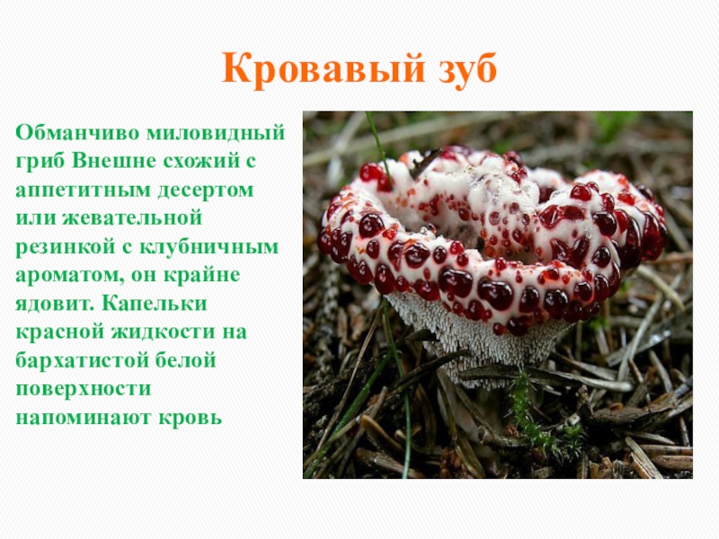 резинкой с клубничным ароматом, он крайне ядовит. Капельки красной жидкости на бархатистой белой поверхности напоминают кровь