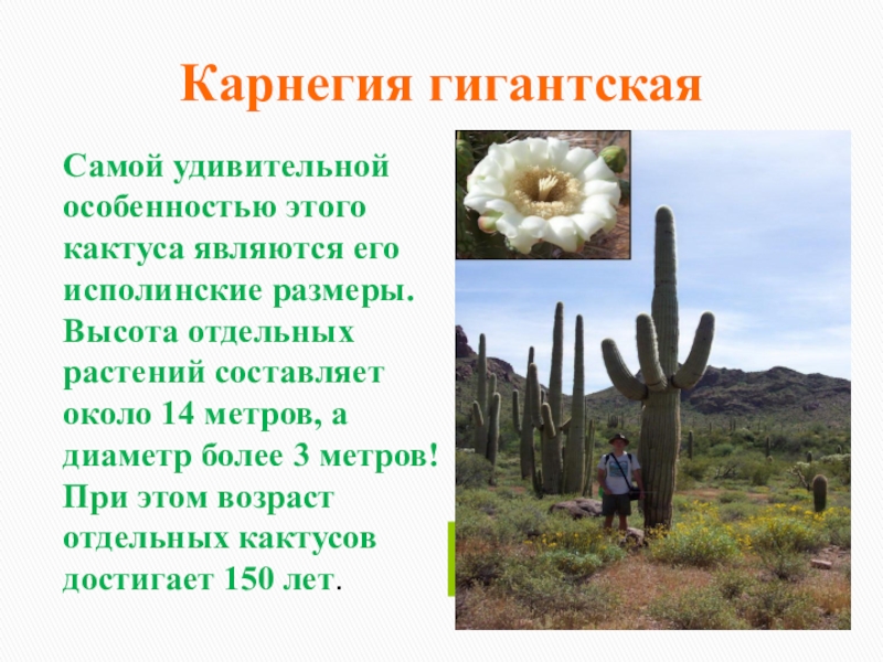 отдельных растений составляет около 14 метров, а диаметр более 3 метров! При этом возраст отдельных кактусов достигает 150 лет.