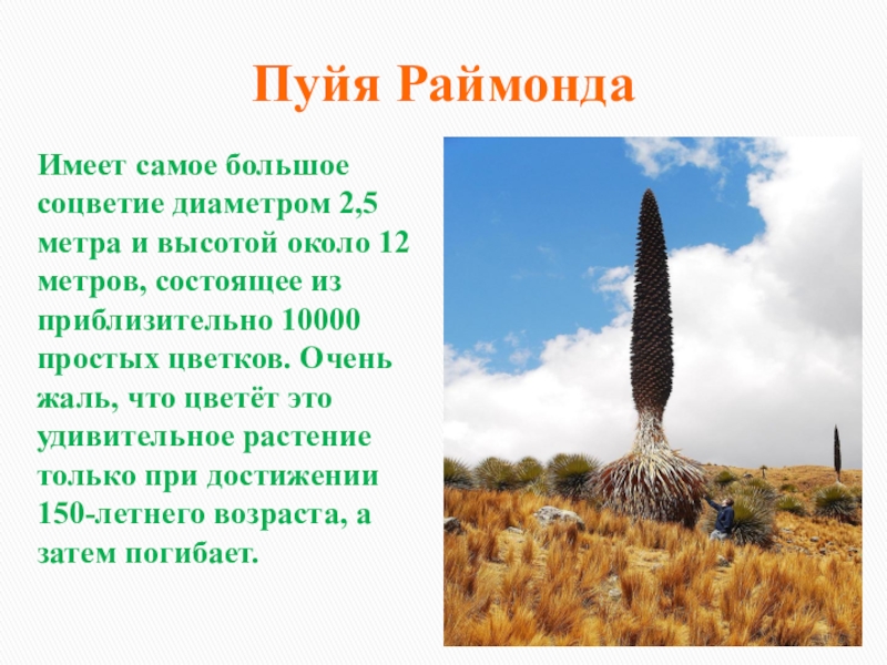 12 метров, состоящее из приблизительно 10000 простых цветков. Очень жаль, что цветёт это удивительное растение только при достижении 150-летнего возраста, а затем погибает.