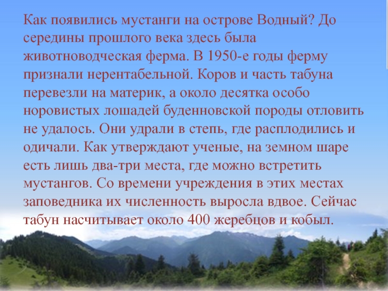 Слайд 27Как появились мустанги на острове Водный? До середины прошлого века здесь