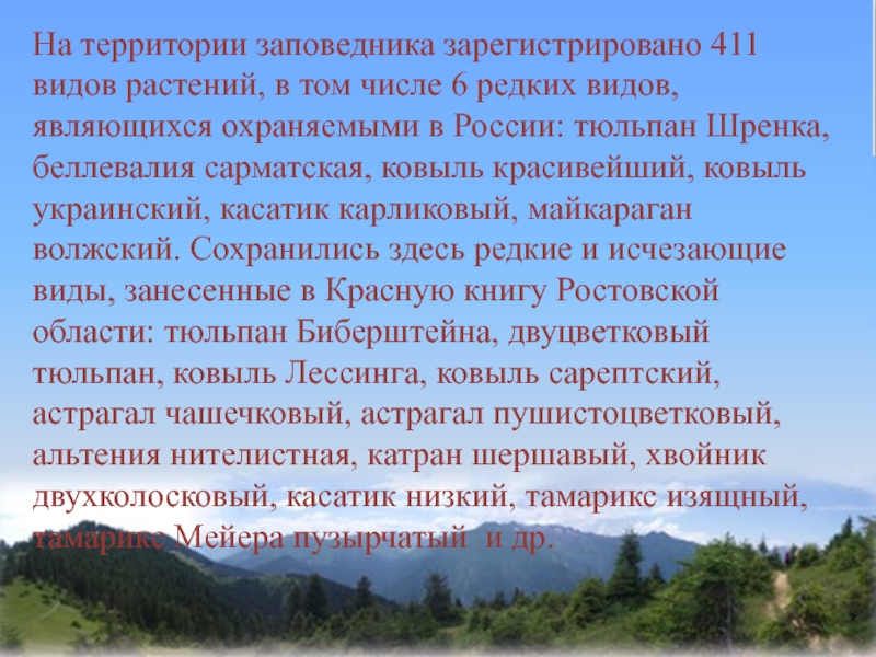 Слайд 4На территории заповедника зарегистрировано 411 видов растений, в том числе 6