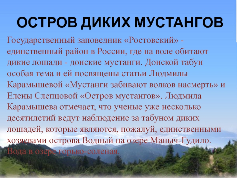 на воле обитают дикие лошади - донские мустанги. Донской табун особая тема и ей посвящены статьи Людмилы Карамышевой «Мустанги забивают волков насмерть» и Елены Слепцовой «Остров мустангов». Людмила Карамышева отмечает, что ученые уже несколько десятилетий ведут наблюдение за табуном диких лошадей, которые являются, пожалуй, единственными хозяевами острова Водный на озере Маныч-Гудило. Вода в озере горько-соленая.
