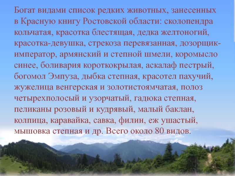 Слайд 11Богат видами список редких животных, занесенных в Красную книгу Ростовской области: