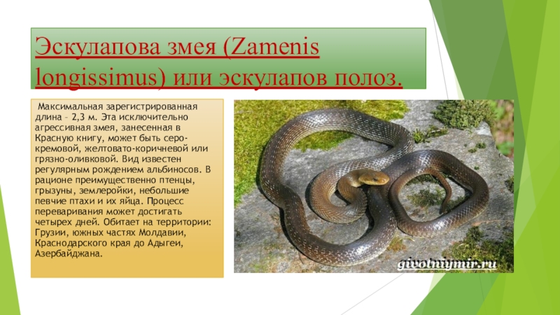 Слайд 4Эскулапова змея (Zamenis longissimus) или эскулапов полоз.