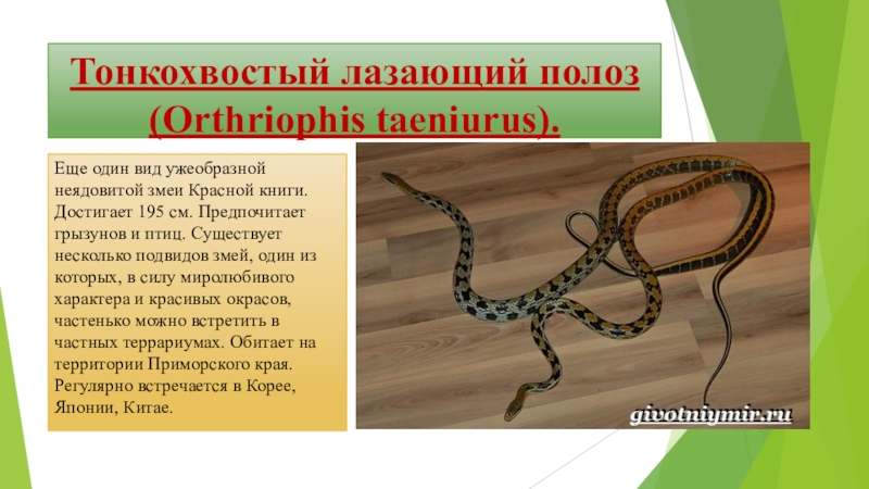 книги. Достигает 195 см. Предпочитает грызунов и птиц. Существует несколько подвидов змей, один из которых, в силу миролюбивого характера и красивых окрасов, частенько можно встретить в частных террариумах. Обитает на территории Приморского края. Регулярно встречается в Корее, Японии, Китае.