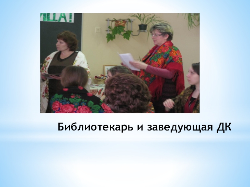Слайд 3Библиотекарь и заведующая ДК
