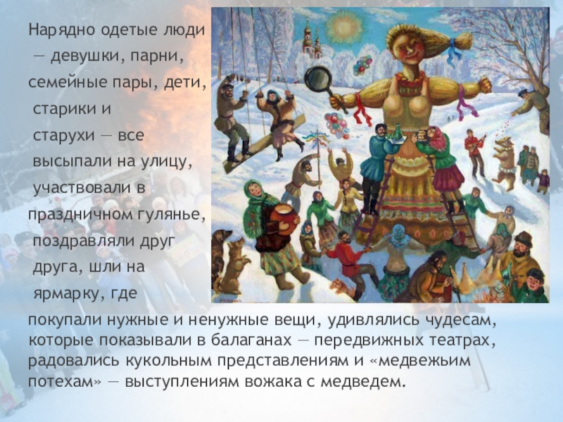 покупали нужные и ненужные вещи, удивлялись чудесам, которые показывали в балаганах — передвижных театрах, радовались кукольным представлениям и «медвежьим потехам» — выступлениям вожака с медведем.