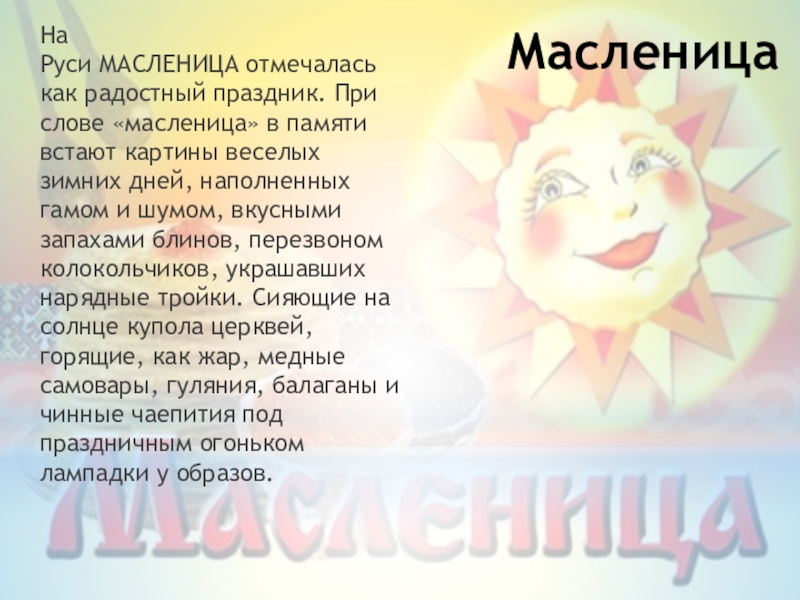 На Руси МАСЛЕНИЦА отмечалась как радостный праздник. При слове «масленица» в памяти встают