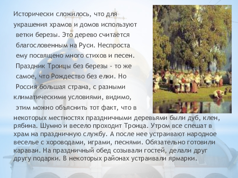людям христианских праздников. К этому времени – а Троица отмечается на пятидесятый день после Пасхи (отсюда и одно из названий) – окончательно просыпается природа, после долгой зимы начинается новая, полноценная и полнокровная жизнь. Полы храмов устилают свежескошенной травой, стены украшают березовыми ветками, даже цвет одежд священников в этот день – зеленый. Это – символ обновления, символ начала. Ведь в этот день родилась наша Церковь.