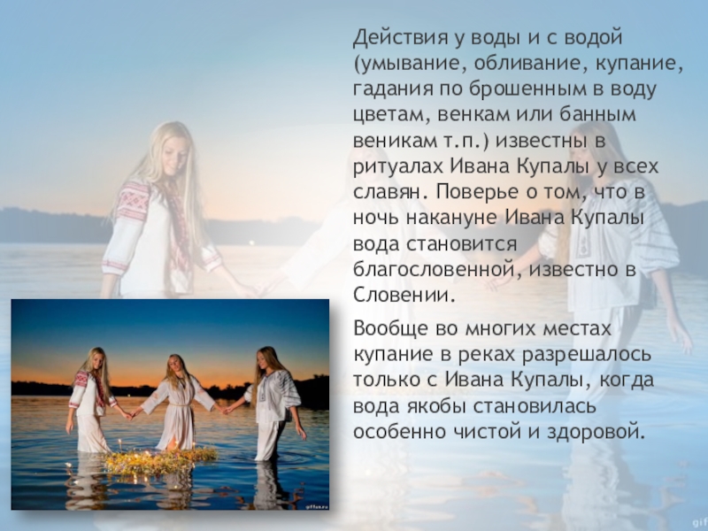 брошенным в воду цветам, венкам или банным веникам т.п.) известны в ритуалах Ивана Купалы у всех славян. Поверье о том, что в ночь накануне Ивана Купалы вода становится благословенной, известно в Словении.
