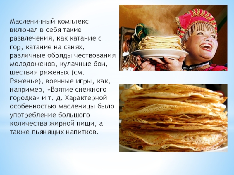 катание на санях, различные обряды чествования молодоженов, кулачные бои, шествия ряженых (см. Ряженье), военные игры, как, например, «Взятие снежного городка» и т. д. Характерной особенностью масленицы было употребление большого количества жирной пищи, а также пьянящих напитков.