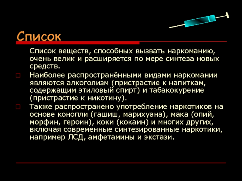 угнетающее или галлюциногенное воздействие на центральную нервную систему, злоупотребление которыми приводит к развитию наркомании.