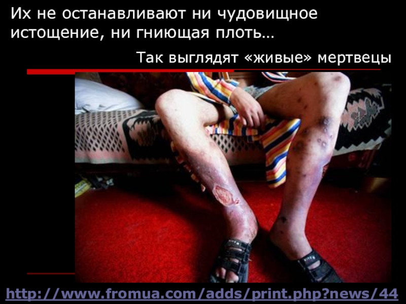 Слайд 25Их не останавливают ни «дорожки» от шприцов, ни болезни…