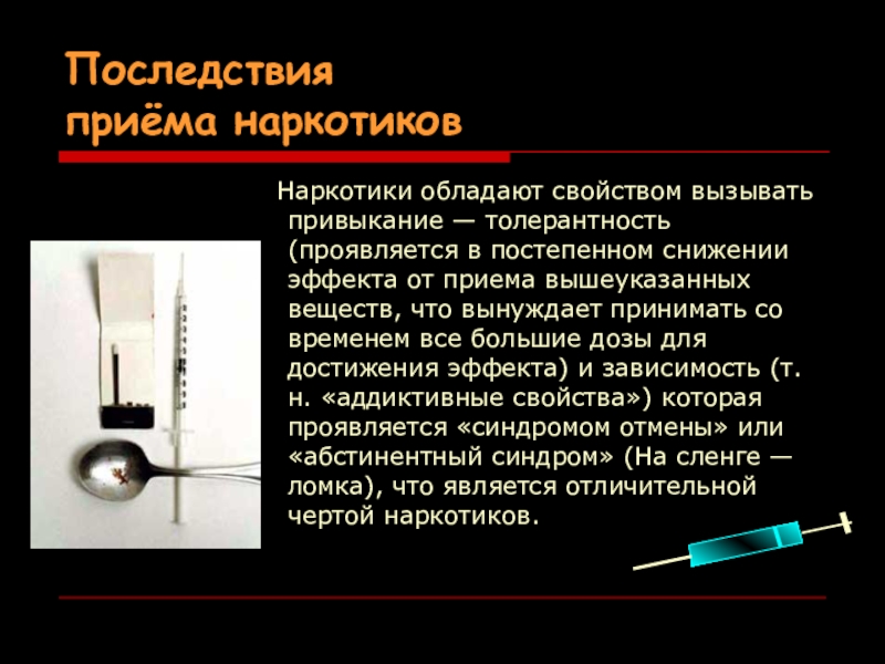 Наркотики обладают свойством вызывать привыкание — толерантность (проявляется