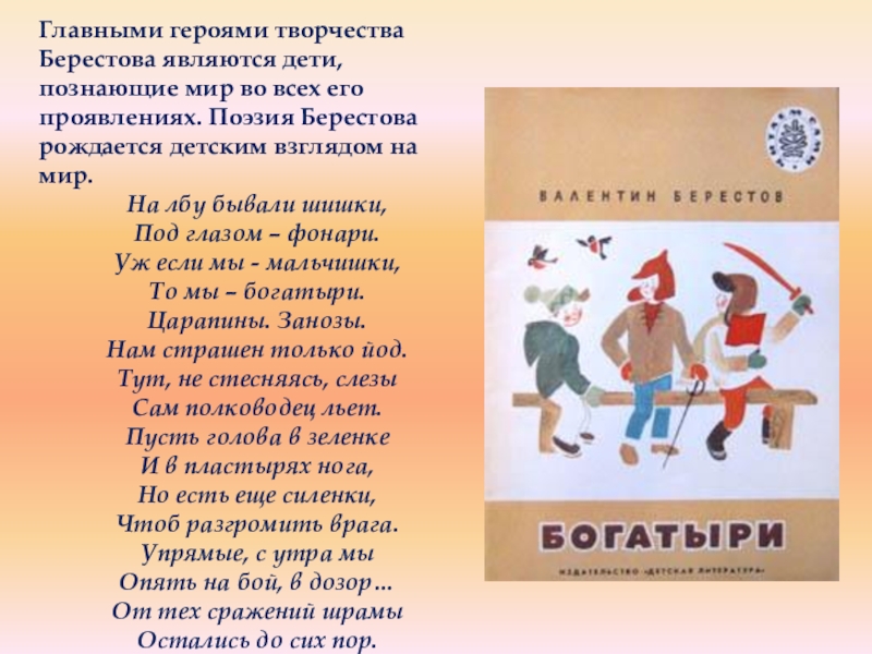 Слайд 13Главными героями творчества Берестова являются дети, познающие мир во всех его