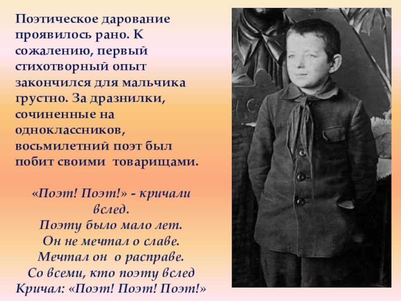 Слайд 7Поэтическое дарование проявилось рано. К сожалению, первый стихотворный опыт закончился для