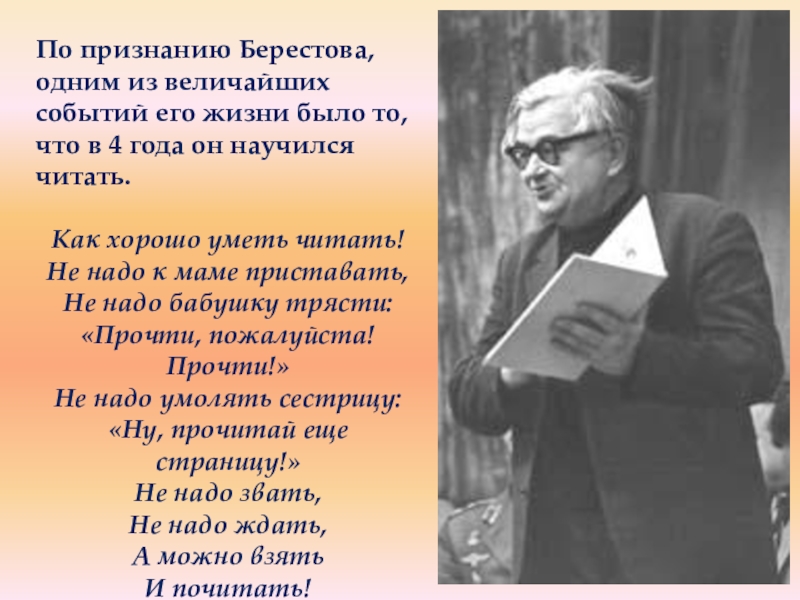 Слайд 6По признанию Берестова, одним из величайших событий его жизни было то,
