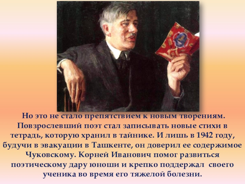 стал записывать новые стихи в тетрадь, которую хранил в тайнике. И лишь в 1942 году, будучи в эвакуации в Ташкенте, он доверил ее содержимое Чуковскому. Корней Иванович помог развиться поэтическому дару юноши и крепко поддержал своего ученика во время его тяжелой болезни.