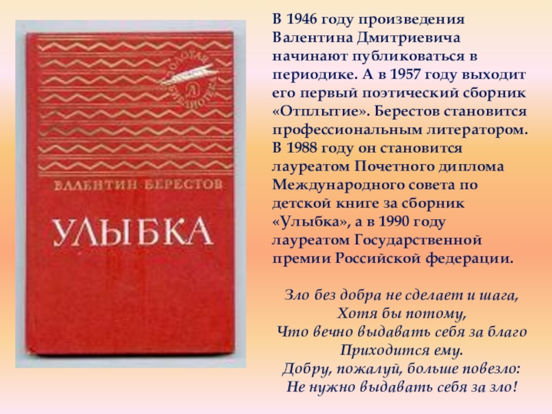 Слайд 12В 1946 году произведения Валентина Дмитриевича начинают публиковаться в периодике. А