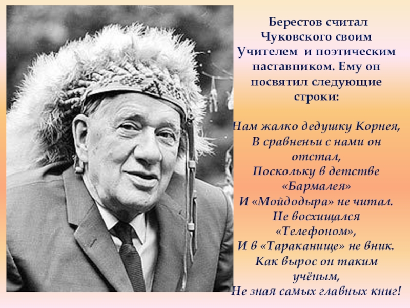 Слайд 10 Берестов считал Чуковского своим Учителем и поэтическим наставником. Ему он