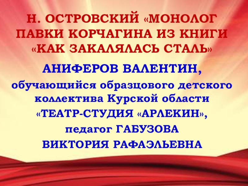 Слайд 27Н. ОСТРОВСКИЙ «МОНОЛОГ ПАВКИ КОРЧАГИНА ИЗ КНИГИ «КАК ЗАКАЛЯЛАСЬ СТАЛЬ»