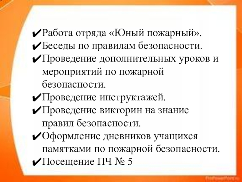 Работа отряда «Юный пожарный».Беседы по правилам безопасности.Проведение дополнительных уроков и мероприятий по пожарной безопасности.Проведение инструктажей.Проведение викторин на