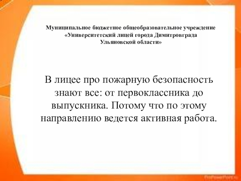 Муниципальное бюджетное общеобразовательное учреждение «Университетский лицей города Димитровграда Ульяновской области»В лицее про пожарную безопасность знают все: от первоклассника до выпускника. Потому что по этому направлению ведется активная работа.