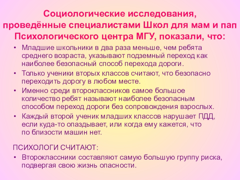 Именно среди второклассников самое большое количество ребят называют наиболее безопасным способом переход дороги без сопровождения взрослых.
