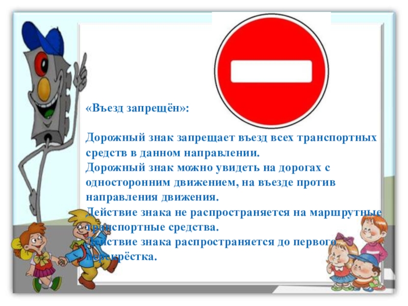 Слайд 5«Въезд запрещён»: Дорожный знак запрещает въезд всех транспортных средств в данном направлении. Дорожный