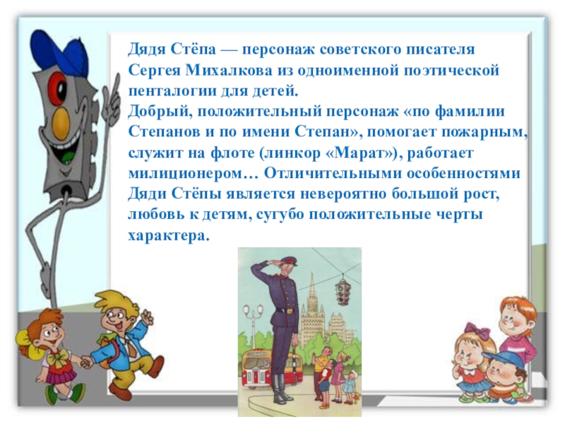 пенталогии для детей. Добрый, положительный персонаж «по фамилии Степанов и по имени Степан», помогает пожарным, служит на флоте (линкор «Марат»), работает милиционером… Отличительными особенностями Дяди Стёпы является невероятно большой рост, любовь к детям, сугубо положительные черты характера.