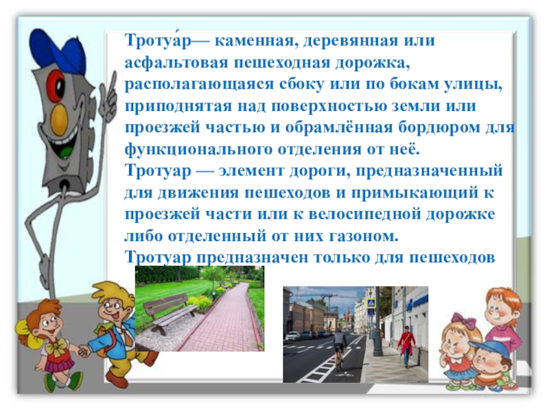 Слайд 7Тротуа́р— каменная, деревянная или асфальтовая пешеходная дорожка, располагающаяся сбоку или по