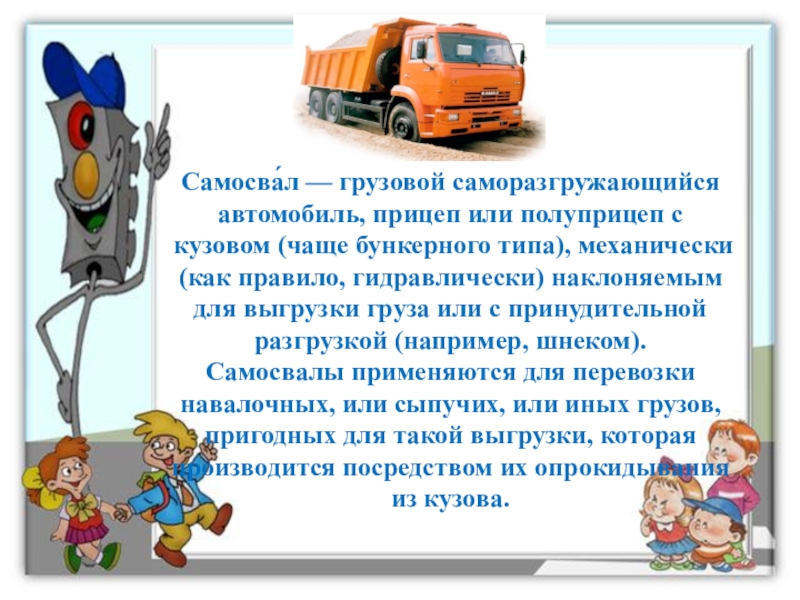Самосвалы применяются для перевозки навалочных, или сыпучих, или иных грузов, пригодных для такой выгрузки, которая производится посредством их опрокидывания из кузова.