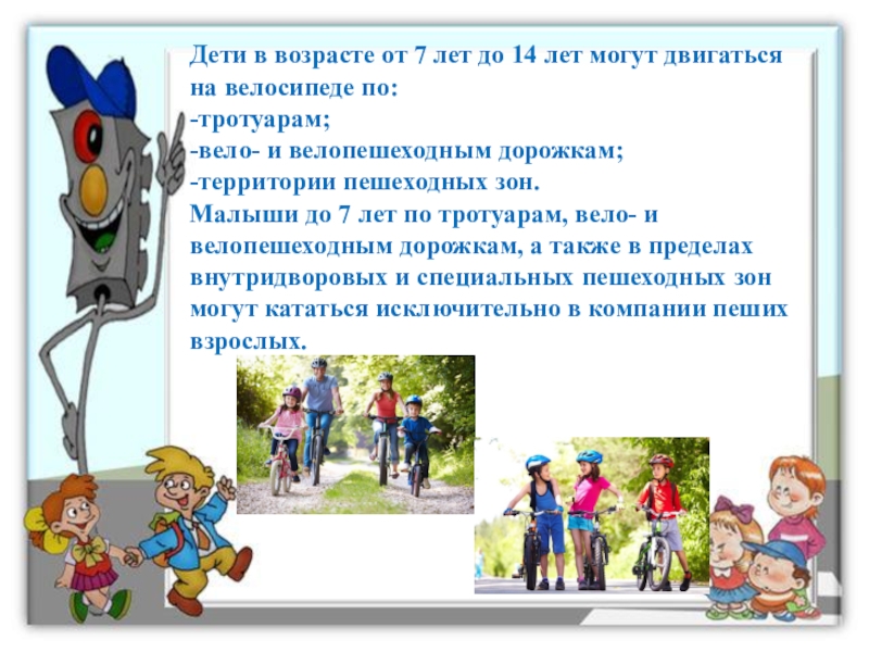 на велосипеде по: -тротуарам; -вело- и велопешеходным дорожкам; -территории пешеходных зон. Малыши до 7 лет по тротуарам, вело- и велопешеходным дорожкам, а также в пределах внутридворовых и специальных пешеходных зон могут кататься исключительно в компании пеших взрослых.