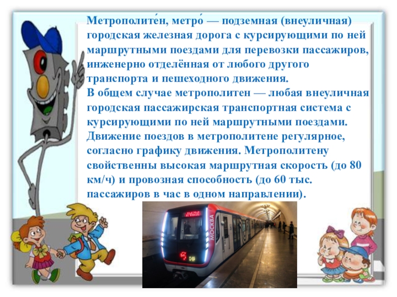 Слайд 10Метрополите́н, метро́ — подземная (внеуличная) городская железная дорога с курсирующими по