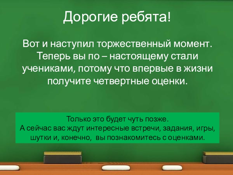 Только это будет чуть позже. А сейчас вас ждут интересные встречи, задания, игры, шутки и, конечно, вы познакомитесь с оценками.