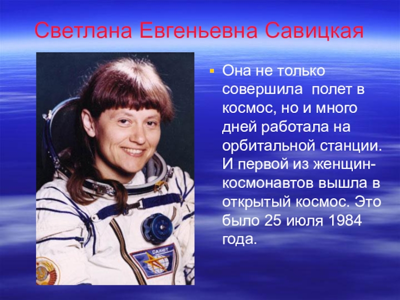 Вторая женщина –космонавт- Светлана Евгеньевна Савицкая. Она не только совершила полет в космос, но и много дней работала на орбитальной станции.