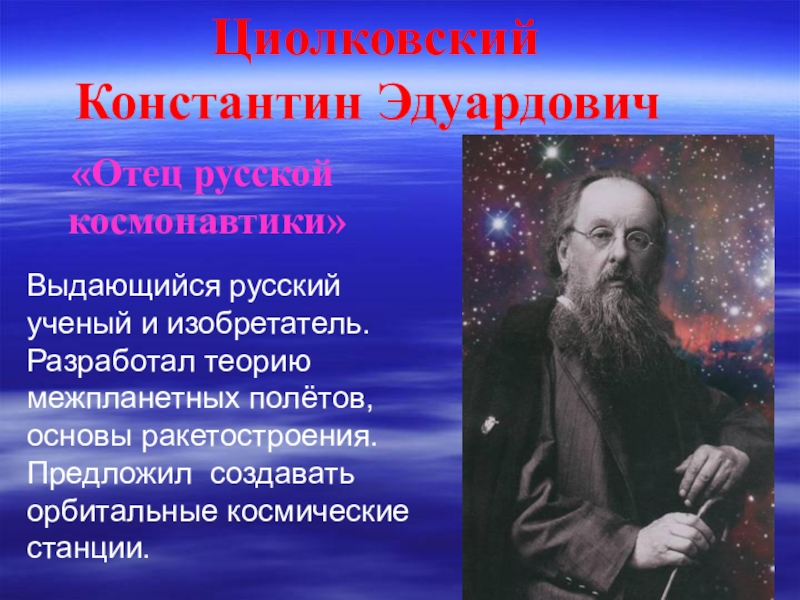 К.Э.Циалковского. Он первым в мире дал описание корабля с реактивным двигателем.
