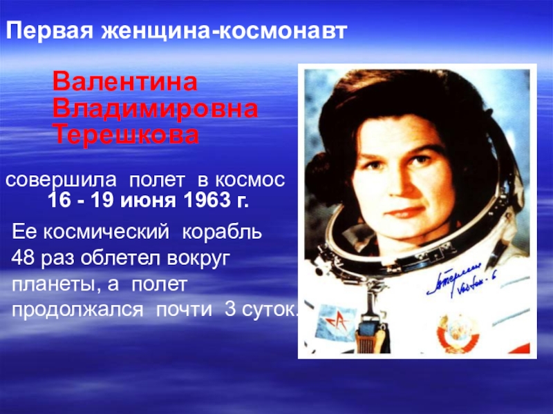 В 1963 году в космос полетела первая женщина –космонавт, Валентина Терешкова.