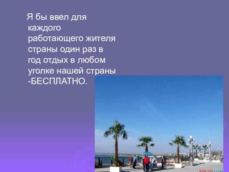 Я бы ввел для каждого работающего жителя страны один раз в год отдых в любом