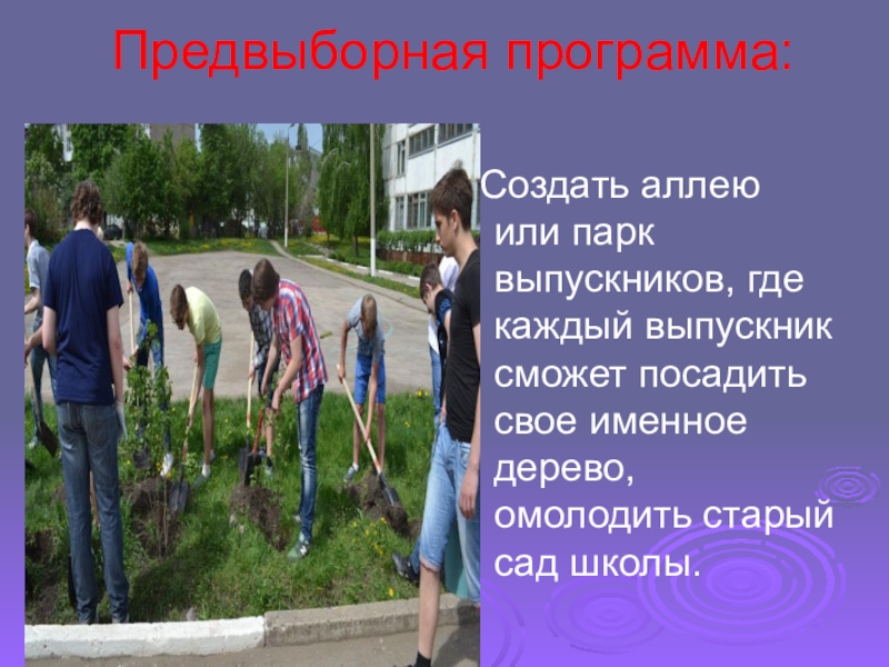 Предвыборная программа:  Создать аллею или парк выпускников, где каждый выпускник сможет посадить свое именное дерево, омолодить