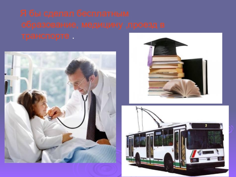 Слайд 15 Я бы сделал бесплатным образование, медицину ,проезд в транспорте