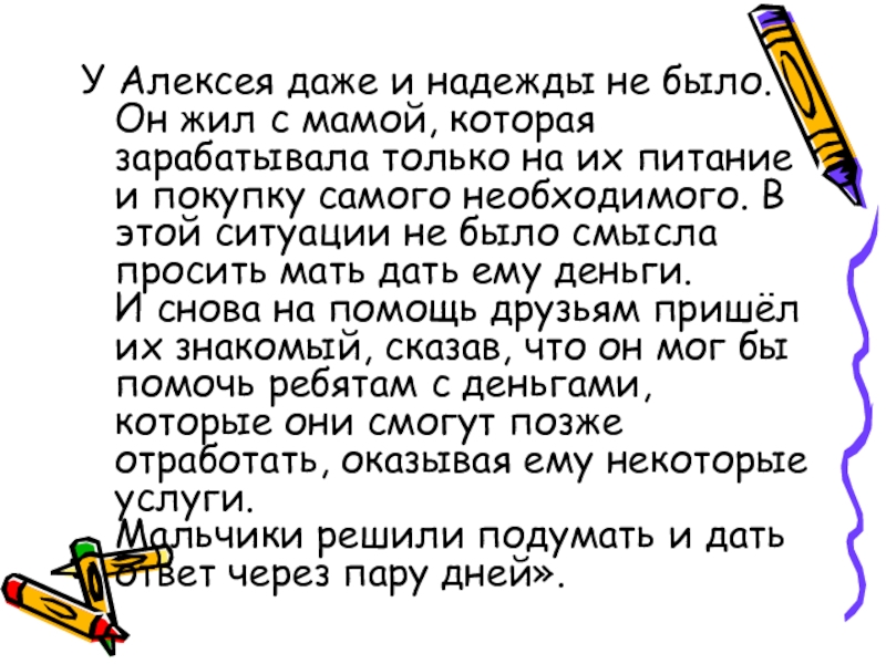 которая зарабатывала только на их питание и покупку самого необходимого. В этой ситуации не было смысла просить мать дать ему деньги. И снова на помощь друзьям пришёл их знакомый, сказав, что он мог бы помочь ребятам с деньгами, которые они смогут позже отработать, оказывая ему некоторые услуги. Мальчики решили подумать и дать ответ через пару дней».