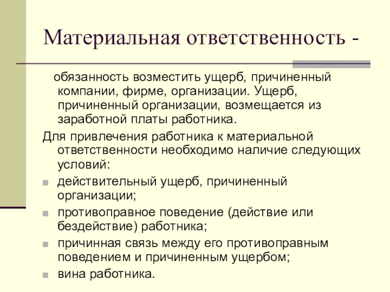 Для привлечения работника к материальной ответственности необходимо наличие следующих условий: