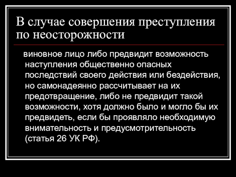 возможность наступления общественно опасных последствий своего действия или бездействия, но самонадеянно рассчитывает на их предотвращение, либо не предвидит такой возможности, хотя должно было и могло бы их предвидеть, если бы проявляло необходимую внимательность и предусмотрительность (статья 26 УК РФ).